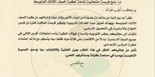 24 يونيو، 2025 اخبار محلية, الأسرة والمجتمع, الرئيسية التعليقات على التربية النيابية تطالب وزارة التربية بمنح فرصة شاملة لطلبة الثالث المتوسط في الدور الثاني مغلقة 4 زيارة