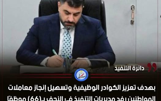 بهدف تعزيز الكوادر الوظيفية وتسهيل إنجاز معاملات المواطنين رفد مديريات التنفيذ في النجف بـ(66) موظف بالتنسيق مع الحكومة المحلية